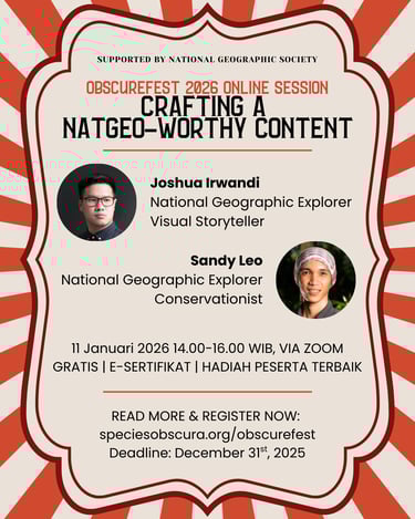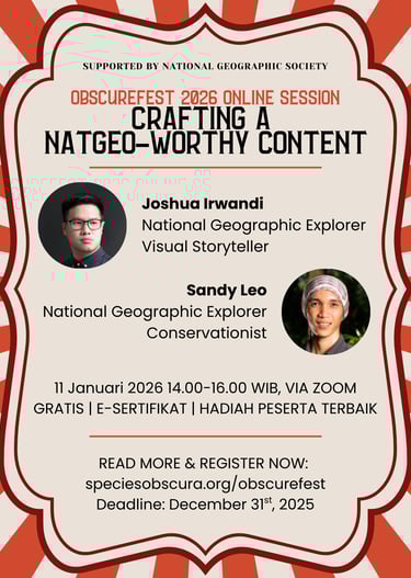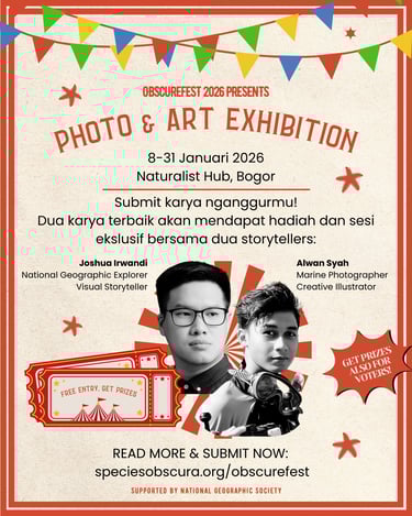 Kamu punya foto atau hasil seni (ilustrasi, kolase, lukisan) yang memuat satwa terabaikan? Segera submit karyamu ke ObscureFest 2026! Seluruh karya akan dimuat di Museum Virtual ObscureFest, dan 20 karya terpilih akan dicetak dan dipamerkan di Naturalist Hub. Dua karya (1 foto dan 1 seni lain) akan dipilih oleh juri dan online vote dan akan memenangkan hadiah piala, voucher Naturalist Hub, dan merchandise Species Obscura dan Toko Bonbeen - masing-masing senilai Rp 500,000, serta sesi private bersama dua storytellers yang telah memproduksi berbagai karya (Joshua Irwandi x Alwan Syah)!