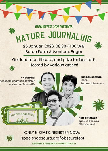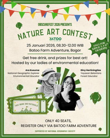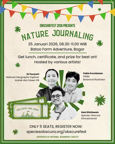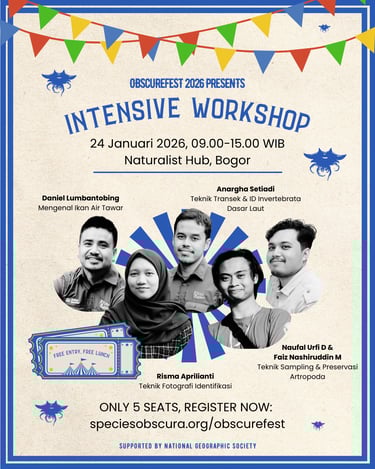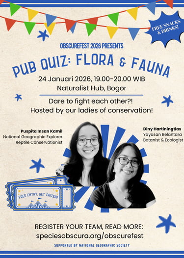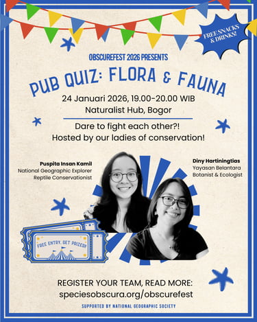 Kamu merasa hafal semua spesies di Indonesia? Ingin menantang pengetahuanmu sendiri melawan ahli-ahli lainnya? Yuk ikuti Pub Quiz ObscureFest 2026! Terbuka untuk dua grup (berisi 3 anggota) untuk flora dan dua grup untuk fauna. Siapkan timmu dari sekarang dan daftarkan pada saat acara makan siang tanggal 24 Januari 2026. Seluruh peserta akan mendapat voucher Naturalist Hub dan pemenang akan mendapat hadiah menarik!