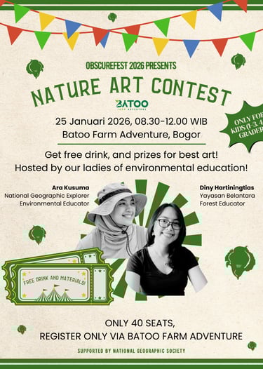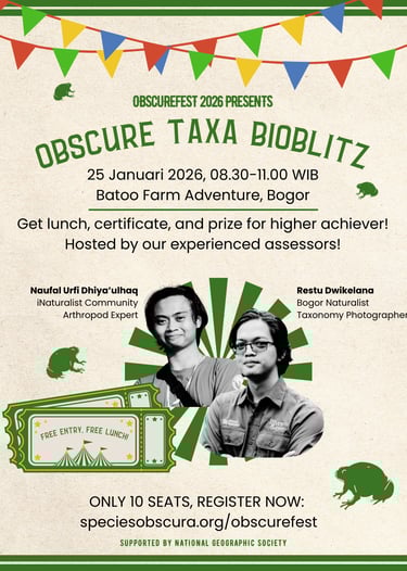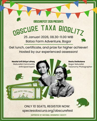 Kamu tertarik merasakan pengalaman singkat menjadi peneliti atau surveyor keragaman hayati? ObscureFest 2026 membuka kesempatan untuk kamu merasakannya lewat BioBlitz di Batoo Farm Adventure! BioBlitz kali ini akan fokus pada kelompok satwa terabaikan: artropoda (termasuk serangga), invertebrata, reptilia, dan amfibia yang akan langsung diupload ke iNaturalist. Dipandu dua asesor handal, Naufal Urfi dan Restu Dwikelana, sesi ini hanya terbuka bagi 10 peserta.