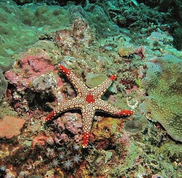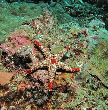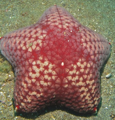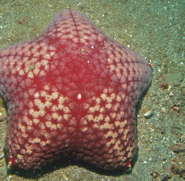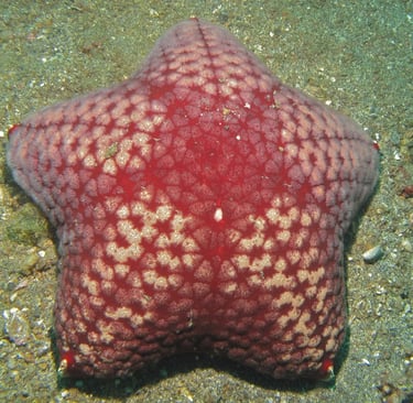 are cushion-shaped and rarer than its common cousin, reef cushion stars (Culcita). Its bulky form sometimes hide symbiotic shrimps that partner with the star for protection.