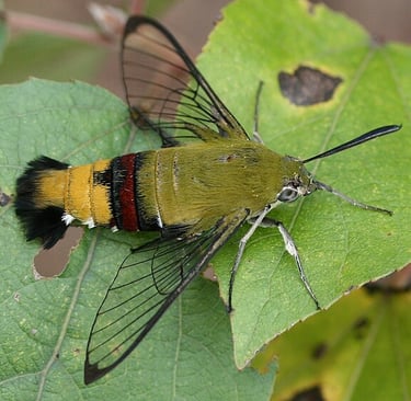 is one strange insect - it appears to mimic bees, but is actually a moth! It is active in daylight and feeds on nectar, hovering like a hummingbird.