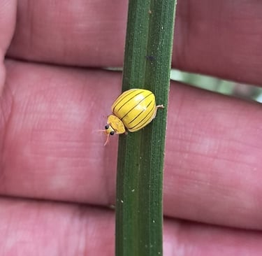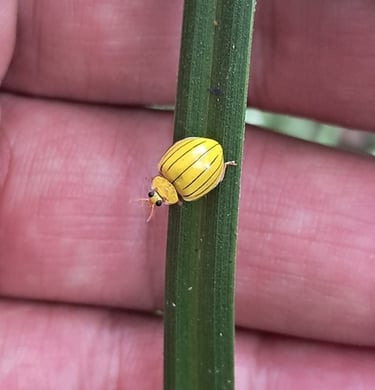 is a lady beetle with bright yellow elytra and black stripes instead of spots. It is often found in bamboo forests and may feed on fungi that would otherwise destroy crops.