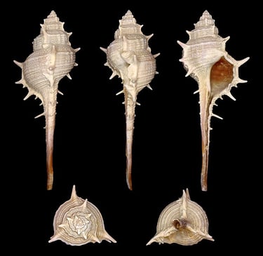 Hated by some fishermen for their wicked spines that tangle fishing nets and injure feet, the rare-spined murex live on sand beds and feeds on other mollusks.
