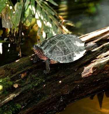 possesses distinct, leaf-shaped carapace. These terrapins live in forest streams and are sadly becoming rarer due to harvests for the pet and food trade.